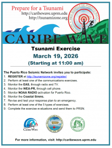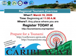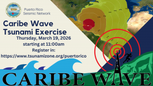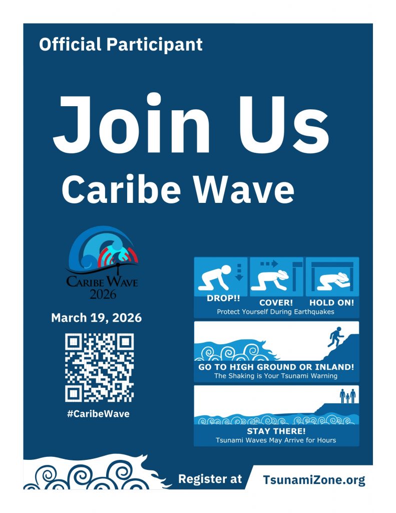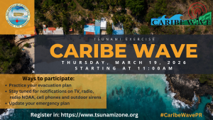 On March 19, the Tsunami Exercise, CARIBE WAVE 2026, will take place, starting at 11:00 a.m. This exercise has as objectives: evaluating the communication systems between emergency agencies and promoting the preparation of the community before a tsunami. To register as a participant and receive more information, visit our website: caribewave.uprm.edu. Register today to participate in the annual tsunami exercise.