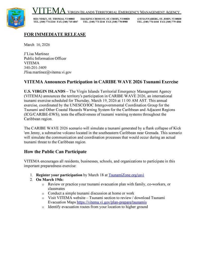 Coastal municipalities recognized as Tsunami Ready are encouraged to test their emergency sirens during the Caribe Wave 2026 exercise at 11:00 am. We encourage the general community to stay alert to the activation of the Coastal Sirens, WEA, NOAA Radio, and EAS system on March 19, 2026, as part of the CARIBE WAVE 2026 exercise.